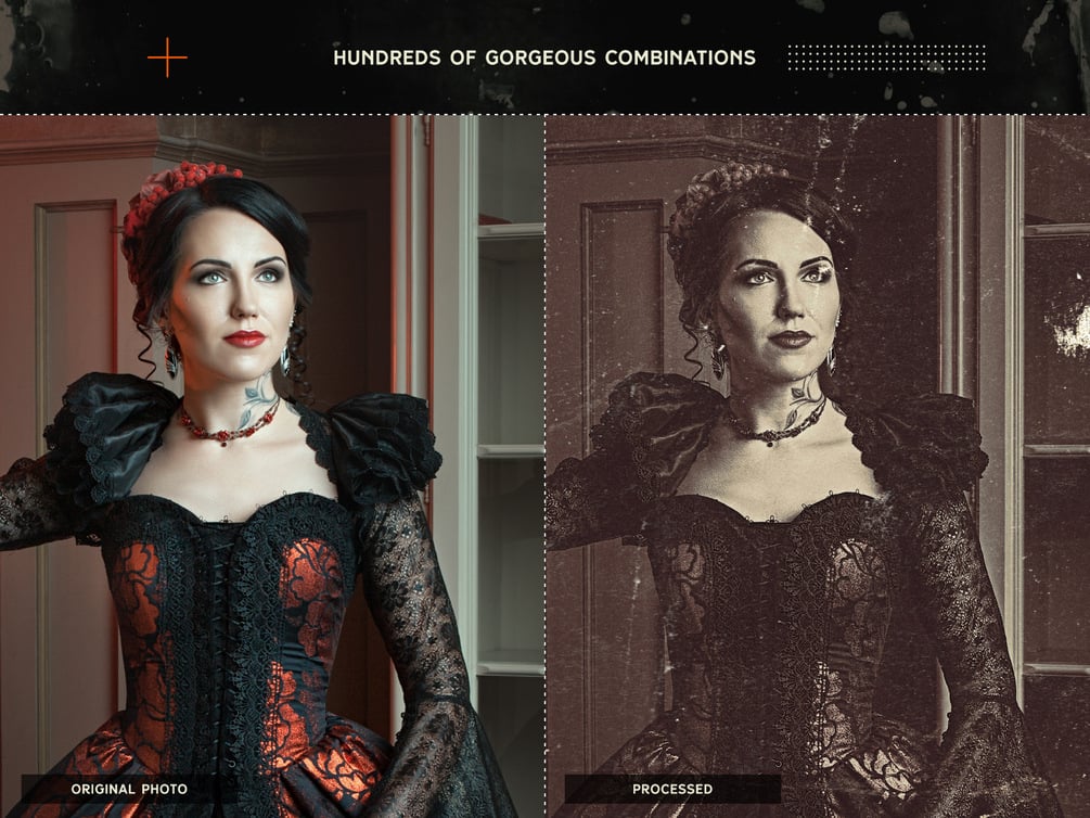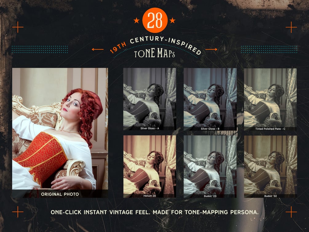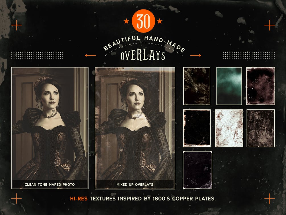 Inspired by 19th-century developing techniques, this practical kit of Tone Maps, Overlays and Macros, will provide you with hours of fun, mangling your pristine high-quality photos and turning them into beautiful pieces of damaged vintage art.