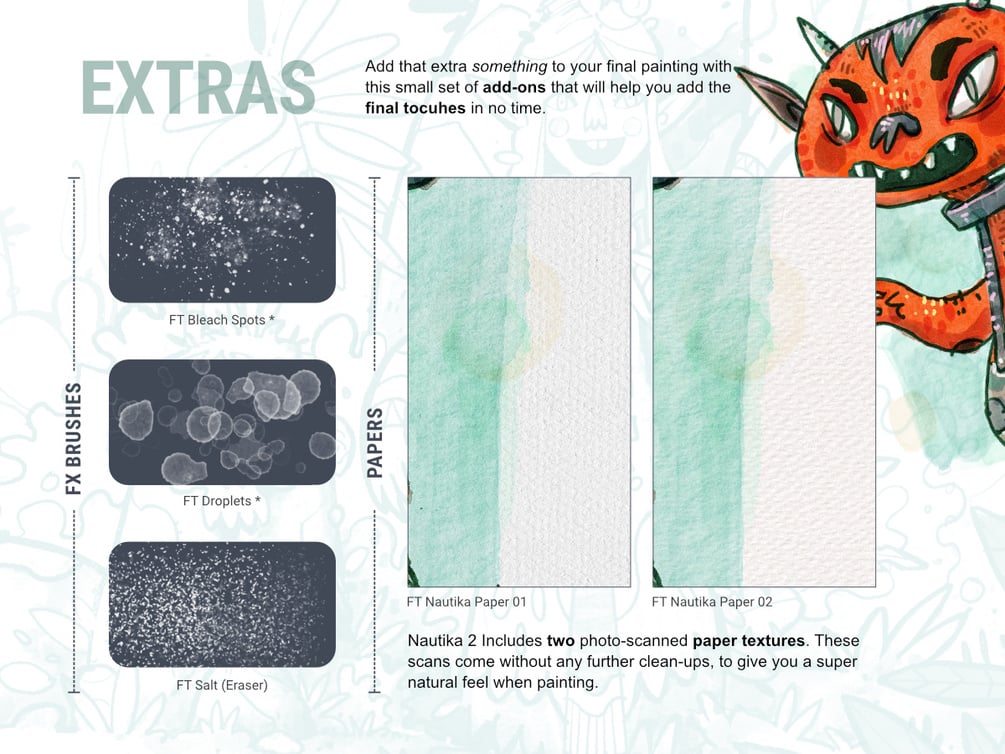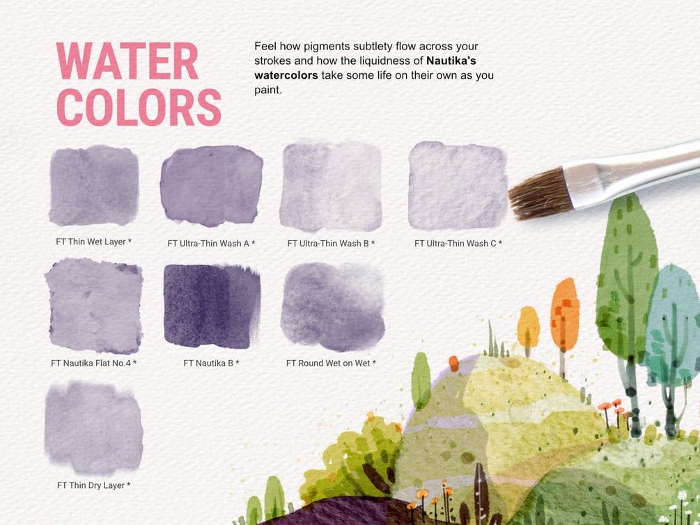 Inks, Water Brushes and Art Markers… a fun set for illustrators and concept artists! From quick sketches to final illustrations, Nautika gives you the right tools to create organic-looking characters, whimsical fantasy backgrounds, magical chidren’s book illustrations and vivid life-studies.
