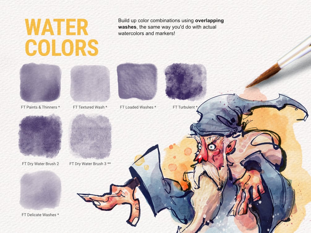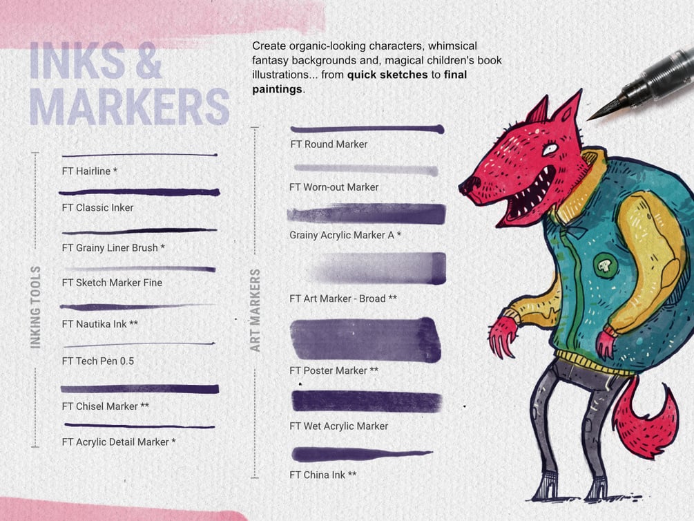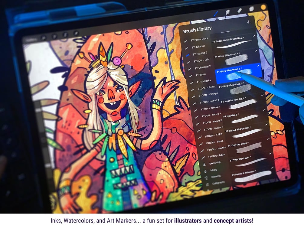 Inks, Water Brushes and Art Markers… a fun set for illustrators and concept artists! From quick sketches to final illustrations, Nautika gives you the right tools to create organic-looking characters, whimsical fantasy backgrounds, magical chidren’s book illustrations and vivid life-studies.