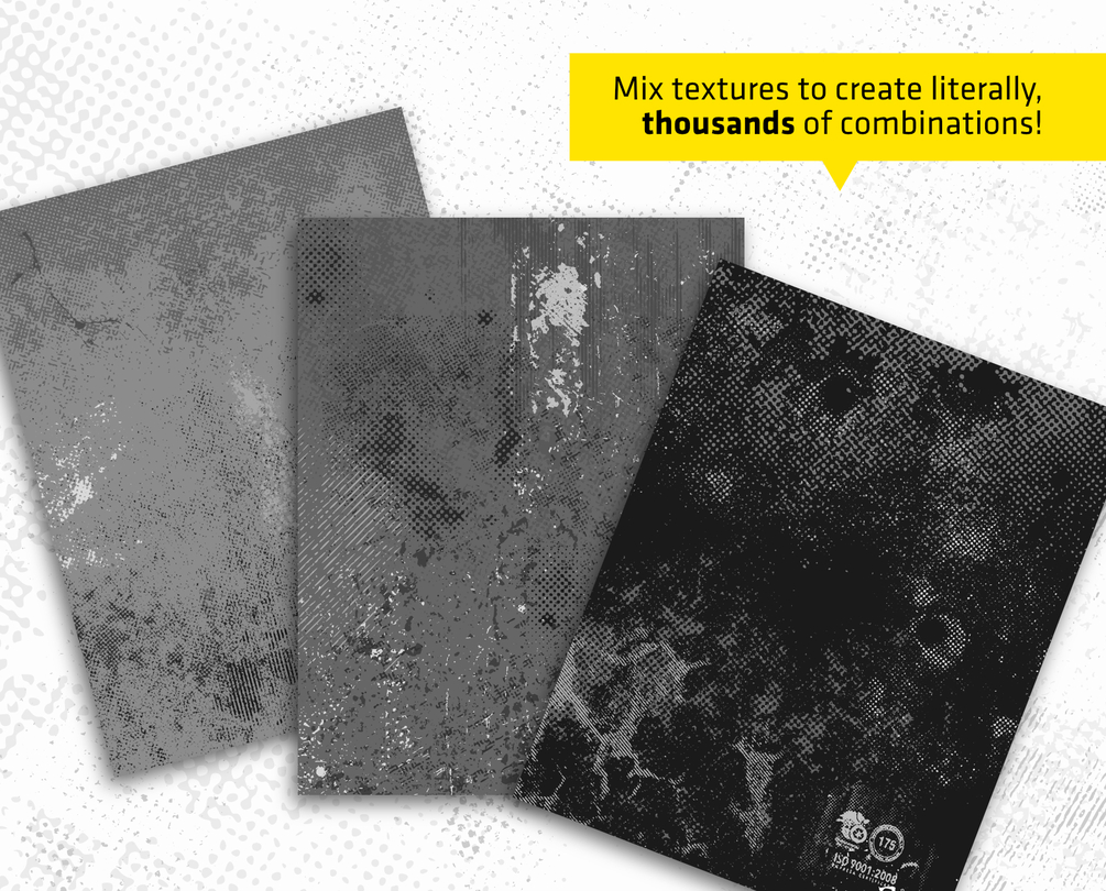 Drag, drop, recolor, resize and repeat! Texture Pack Vol.2 for Affinity Designer allows you to non-destructively, add gritty and grungy textures to your illustrations and designs. This Affinity Designer exclusive is a must-have for die-hard fans of chaos and destruction (artistically and peacefully speaking).